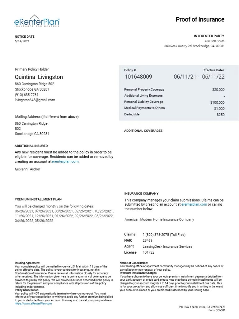 Renters Insurance Declaration Page Template Lifelia